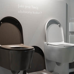 Na stoisku Roca mieniło się od kolorów i wykończeń zarówno błyszczących jak i matowych. Wszystko za sprawą bogatej oferty kolorów ceramiki, brodzików i wykończeń baterii.