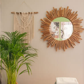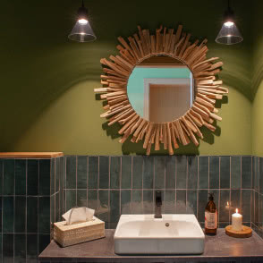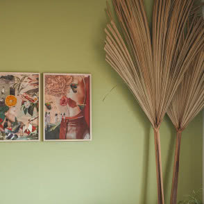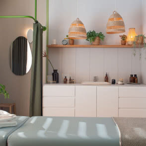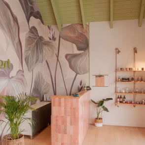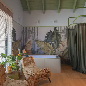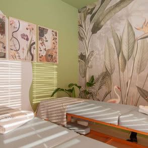 Plakaty, kolaże i tapety łączą się idealnie w spójną całość. Natura, zieleń, egzotyka to dominujące tematy, z którymi spa jest nieodłącznie związane, dlatego pojawia się tu dużo motywów roślinnych ale również naturalnych materiałów i wykończeń.