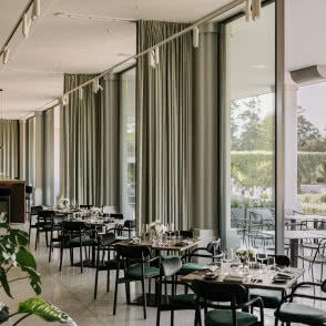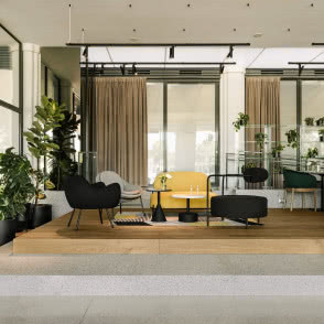 Najważniejszą stroną lokalu jest jednak sam widok na Pergolę i fontannę. Przy witrynie postawiono na eleganckie i mięsiste kurtyny w dość niecodziennym ustawieniu - dzięki ułożeniu ich prostopadle do przeszkleń pozwala na niezakłócony odbiór założenia Maxa Berga i zezwala na jego płynne wejście do środka konceptu. Materiał, oprócz walorów akustycznych oraz estetycznych, pełni również funkcję przegród między stolikami - daje poczucie intymności i pozwala na swobodne aranżowanie większych bądź mniejszych rezerwacji wzdłuż witryn.