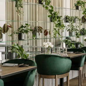 W poszukiwaniu materiałów do projektu architekci skupili się jedynie na najbliższym otoczeniu Hali Stulecia. Miętowo-szary odcień zasłon dobrano do kolorystyki charakterystycznych kolumn, złoty kolor akcentów to inspiracja z przeszklenia kopuły Hali, zaś płyty z jasnego lastryko, z zielonymi drobinkami, pozwoliły nam na przemycenie do wnętrza jeszcze większej ilości zieleni i nawiązują do wszechobecnej natury widocznej na Pergoli. Drewno w głębokim i dojrzałym odcieniu dodaje restauracji przytulności i szlachetności.