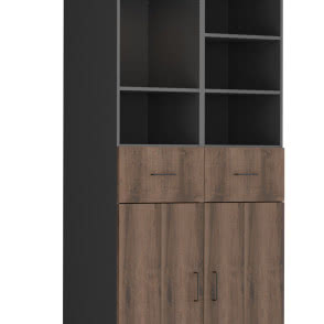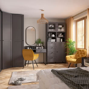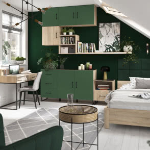 Zaletą systemu Modeo jest szeroka paleta kolorów, dzięki której możesz projektować meble do spokojnych, minimalistycznych aranżacji, jak i tych pełnych życia i różnorodnych barw. Do wyboru masz dekory drewna oraz uniwersalną czerń, grafit i biel. Projektując mebel, możesz też wybrać kolory, które będą mocnym akcentem wnętrza, takie jak zieleń, ciemny błękit czy salsa. Dobierz ich styl i kolor tak, by idealnie pasowały do całości.