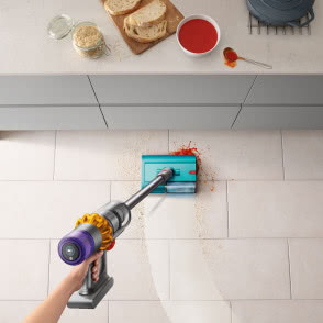 Precyzyjnie zaprojektowana elektroszczotka z wałkiem do czyszczenia na mokro Dyson Submarine™ zużywa dokładnie tyle wody, ile potrzeba, aby skutecznie usunąć rozlane płyny, uporczywe plamy i drobne suche zanieczyszczenia, takie jak np. okruszki.