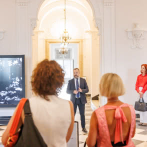 W odnowionym Pałacu Rzeczypospolitej 8 sierpnia br. OKK! PR zorganizowało oficjalne oprowadzanie z udziałem dr. Tomasza Makowskiego, dyrektora Biblioteki Narodowej oraz ponad 60 specjalnie na tę okazję zaproszonych gości - przedstawicieli czołowych pracowni architektonicznych i mediów. W rolę przewodnika wcielił się sam Tomasz Konior, który przybliżył uczestnikom sekrety pałacowych wnętrz, opowiadał o ich rewitalizacji oraz przechowywanych w nich skarbach polskiego i światowego piśmiennictwa. Mecenasami wydarzenia byli Geberit i Wiśniowski.