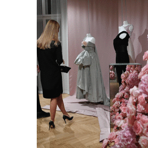 - jedwabną suknię balową zaprojektowaną w 1954 roku przez samego Christiana Diora, która zachwyca kobiecą formą i wyjątkowym kunsztem wykonania,