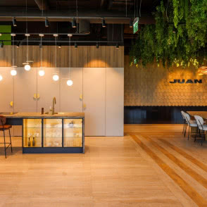 Nowy showroom, dzięki szerokiej prezentacji dostępnych materiałów własnych oraz innych renomowanych producentów, doskonale łączy biurową estetykę z autentycznie domowym klimatem. Nowatorsko rozplanowane wnętrza to ukłon w stronę przytulności, wyczuwalnej w aranżacjach z wygodnymi sofami, zasłonami, pełnowymiarową kuchnią i garderobą oraz efektowną zielenią zwisającą z sufitu. Połączenie różnorodnych stref buduje niezwykłą atmosferę, która doskonale pomoże klientom wyobrazić sobie, jak produkty JUAN mogą wpisać się w ich własne domowe przestrzenie.