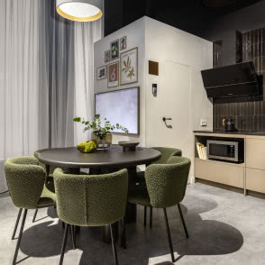- Pomieszczenie zostało przystosowane do pokazów dla małych szcześcio-, ośmioosobowych grup, aby w kameralnej atmosferze dać możliwość lepszego zapoznania się z wszystkimi możliwościami, które dają prezentowane tu rozwiązania technologiczne. Postawiłam tu na stonowaną kolorystykę, która tworzy przytulny, domowy klimat, a jednocześnie jest zgodna z obowiązującymi trendami. Dominuje tu biel, czerń, szarości, beże oraz kolorystyczny akcent w postaci ciemnozielonych tapicerowanych krzeseł - mówi architekt wnętrz Agnieszka Zaranek z pracowni Decoroom.