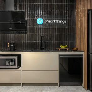 Wnętrze o powierzchni 33 m kw. zostało podzielone na trzy strefy - aneks kuchenny, kącik jadalniany i wypoczynkowy. W każdej z tych części znalazły się przynależące do niej urządzenia klasy AI, między innymi szafa odświeżająca ubrania, inteligentny robot sprzątający czy lodówka z dotykowym ekranem i wewnętrzną kamerą. Aby maksymalnie wykorzystać dostępną przestrzeń i jednocześnie odpowiednio wyeksponować rozwiązania marki Samsung, zastosowano tu zabudowę kuchenną na wymiar ze stolarni Decoroom. Powstała tam również podwieszana szafka RTV. Całość jest stonowana i harmonijna, a brak zbędnych ozdobników pozwala w pełni skupić się na prezentowanych rozwiązaniach.