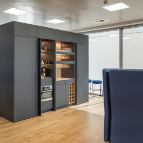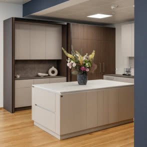 Zgodnie z aktualnymi trendami postawiliśmy na układy kuchenne z ukrytymi strefami. Dzięki systemom przesuwnym HAWA udało się zaplanować między innymi schowaną strefę parzenia kawy, barek śniadaniowy, przestrzeń do serwowania wina czy tzw. mokrą strefę z ukrytym zlewem i koszem na śmieci. Po zamknięciu wszystko znika za gładkimi frontami, co pozwala zachować estetykę i porządek. Tego typu zabudowy pokazują, jak funkcjonalnie można zorganizować codzienność, nie rezygnując z elegancji.