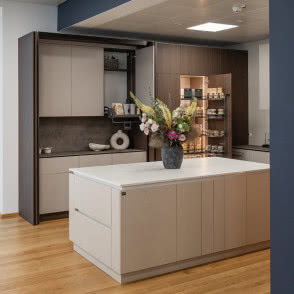 Podobnie podeszliśmy do systemów narożnych. W showroomie można porównać trzy flagowe rozwiązania narożne – zestawione w jednej kuchni, by klient mógł poczuć, który system najlepiej odpowiada jego potrzebom. Każdy z nich został wyposażony zgodnie z przeznaczeniem: jeden pokazuje przechowywanie garnków, inny – zapasów. Chcieliśmy pokazać, że wybór systemu powinien zależeć nie tylko od mechaniki, ale też od tego, co konkretnie ma być w nim przechowywane. Taka ekspozycja pozwala sprawdzić nie tylko pojemność, ale też ergonomię ruchu, komfort korzystania z codziennych funkcji kuchni.
