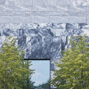 - nie wpływa w żaden sposób na czystość linii fasad, co w projekcie bazującym na rytmie i tektonice marmuru ma fundamentalne znaczenie,