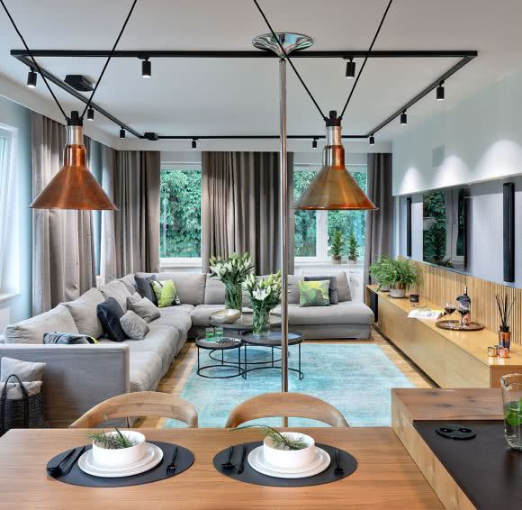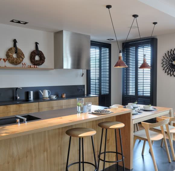 Stół, krzesła, hokery Etnicraft/ NAP. Płyty na podłodze Marazzi. Lampy nad stołem DCW éditions.