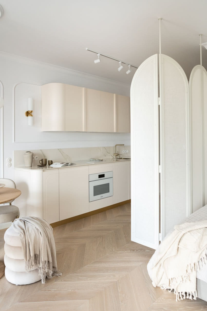 Nowoczesna kawalerka w beżu i złocie. Ma tylko 27 metrów kwadratowych!