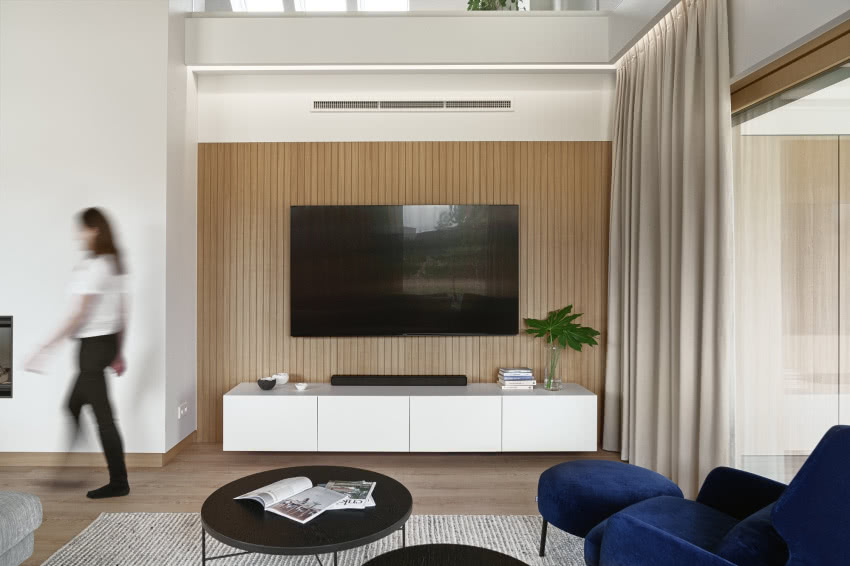Minimalistyczny dom na Kaszubach. Ma wysoki sufit nad salonem i antresolę!