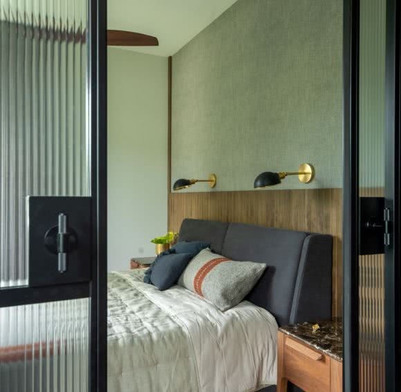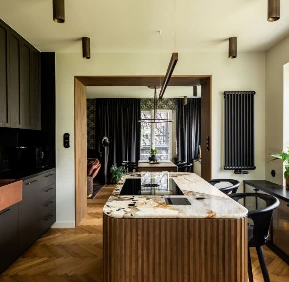 Welurowa sofa Saba Italia w odcieniu ciepłego brązu efektownie prezentuje się na tle wzorzystej tapety.