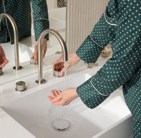 Elegancka łazienka w stylu quiet luxury z bateriami MOZA316L.